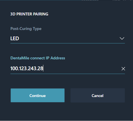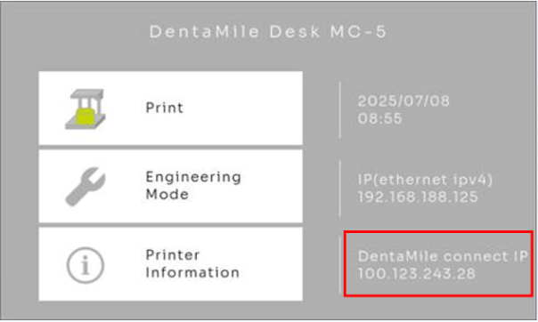Navigate to the start screen from the printer menu (house icon). Make a note of the “DentaMile connect IP address”
