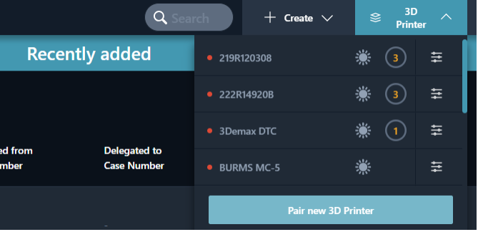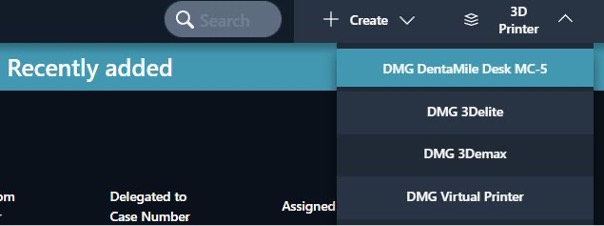 In the Producer option, you have the option of remotely selecting your printer (which you will have previously connected) at the end of the design workflow, and of sending the print job directly to your DentaMile Desk MC-5 printer, irrespective of its location (provided it is switched on and connected to the Internet). The nesting, supporting and slicing processes will all be performed automatically for you in the cloud.